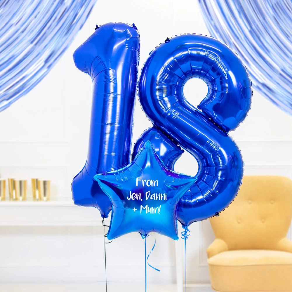 Mark their 18th birthday with this stunning bunch of helium balloons, complete with personalised message! Each helium balloon bouquet includes two bright blue 26″ number balloons and a 20″ blue foil star, all tied together with curling ribbon and a balloon weight. This stunning balloon bunch arrives fully inflated in a box and will stay afloat for around 3-5 days! Our stunning bunches make a truly unique gift and can be delivered to the lucky celebrants door on a day of your choice or are a lovely decoration to make them smile first thing in the morning!