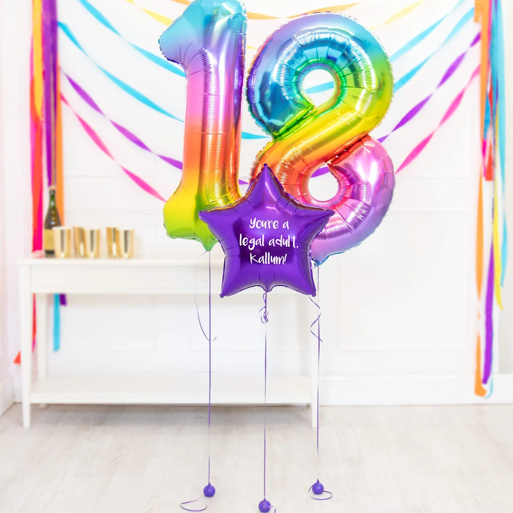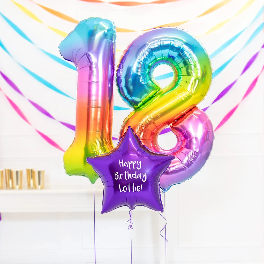 Mark their 18th birthday with this stunning bunch of helium balloons, complete with personalised message! Each helium balloon bouquet includes two bright rainbow 34″ number balloons and a 20″ purple foil star, all tied together with curling ribbon and a balloon weight. This stunning balloon bunch arrives fully inflated in a box and will stay afloat for around 3-5 days! Our stunning bunches make a truly unique gift and can be delivered to the lucky celebrants door on a day of your choice or are a lovely decoration to make them smile first thing in the morning!
