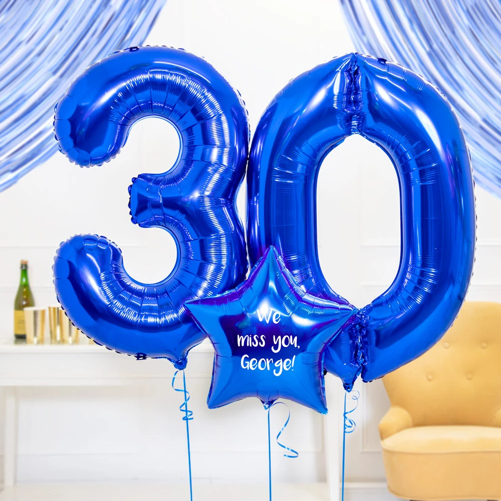 Mark their 30th birthday with this stunning bunch of helium balloons, complete with personalised message! Each helium balloon bouquet includes two bright blue 26″ number balloons and a 20″ blue foil star, all tied together with curling ribbon and a balloon weight. This stunning balloon bunch arrives fully inflated in a box and will stay afloat for around 3-5 days! Our stunning bunches make a truly unique gift and can be delivered to the lucky celebrants door on a day of your choice or are a lovely decoration to make them smile first thing in the morning!