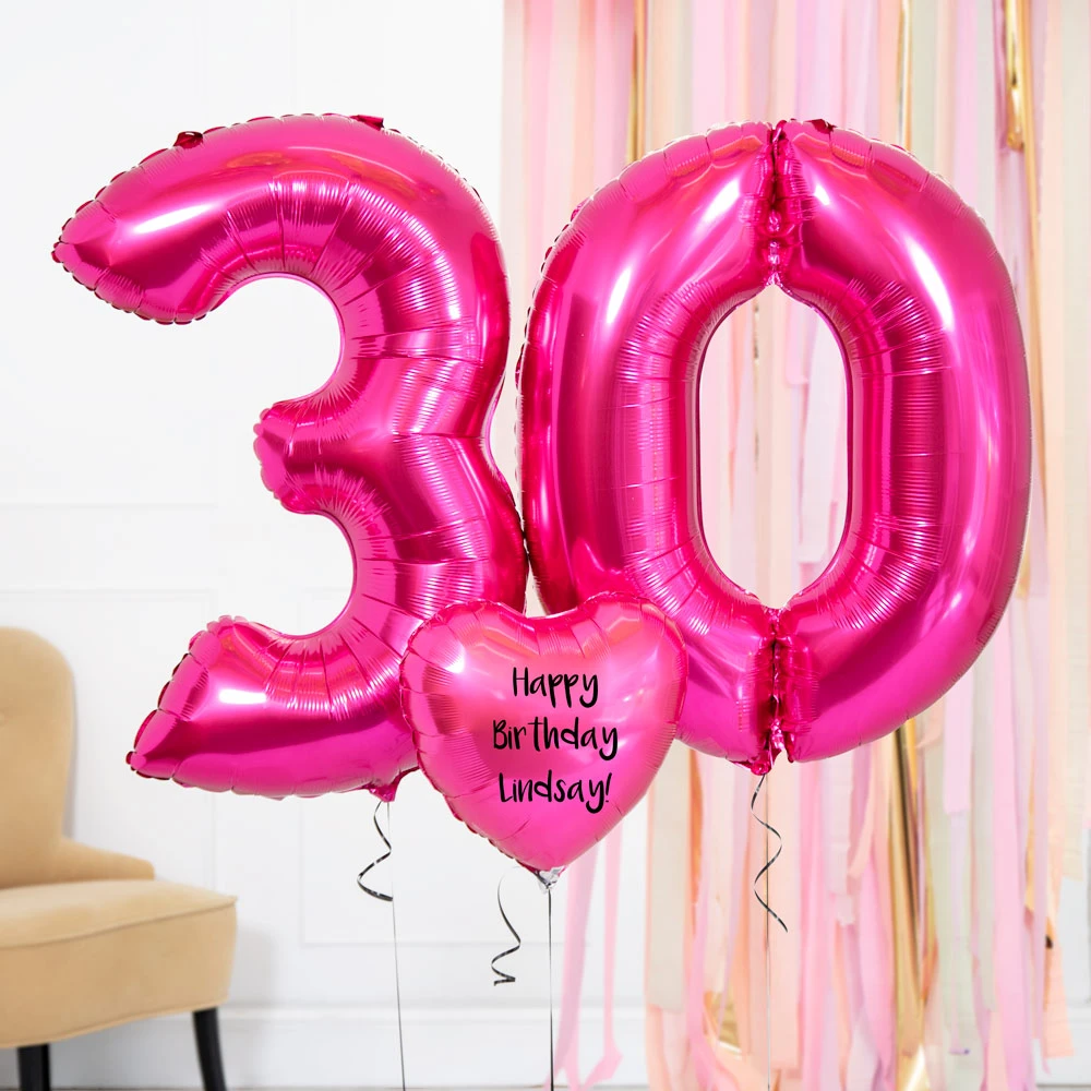 Mark their 30th birthday with this stunning bunch of helium balloons, complete with personalised message! Each helium balloon bouquet includes two bright pink 26″ number balloons and a 20″ pink foil heart, all tied together with curling ribbon and a pink balloon weight. This stunning balloon bunch arrives fully inflated in a box and will stay afloat for around 3-5 days! Our stunning bunches make a truly unique gift and can be delivered to the lucky celebrants door on a day of your choice or are a lovely decoration to make them smile first thing in the morning!