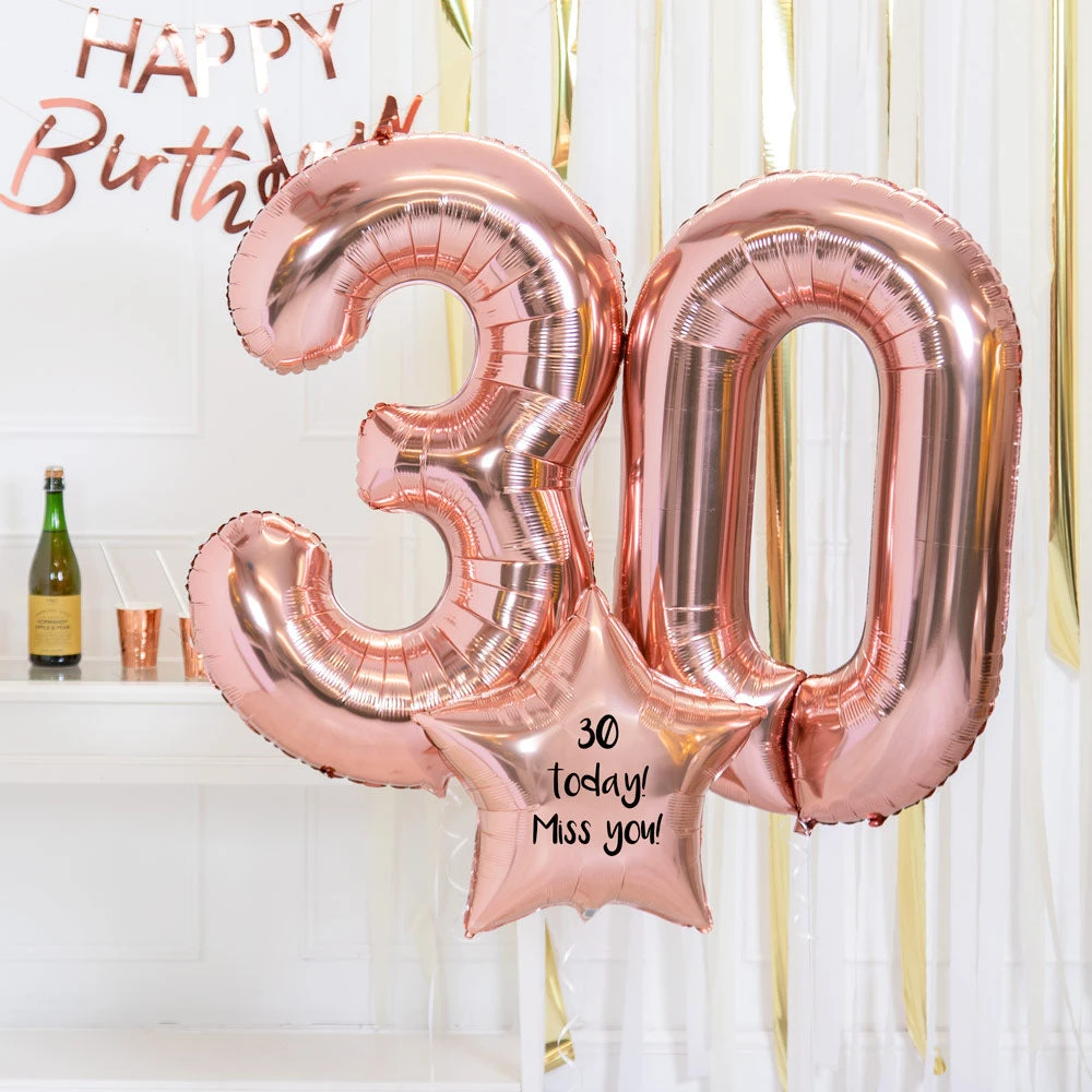 Mark their 30th birthday with this stunning bunch of helium balloons, complete with personalised message! Each helium balloon bouquet includes two metallic rose gold 34″ number balloons and a 20″ rose gold foil star, all tied together with curling ribbon and a balloon weight. This stunning balloon bunch arrives fully inflated in a box and will stay afloat for around 3-5 days! Our stunning bunches make a truly unique gift and can be delivered to the lucky celebrants door on a day of your choice or are a lovely decoration to make them smile first thing in the morning!