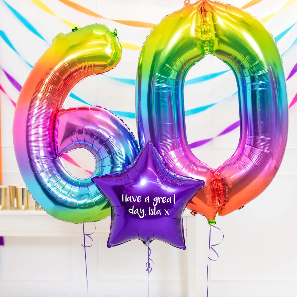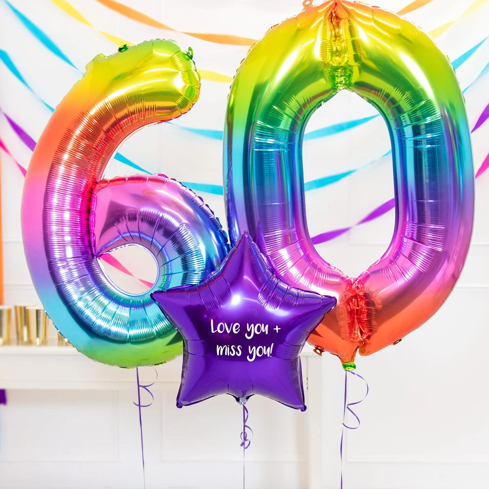 Mark their 60th birthday with this stunning bunch of helium balloons, complete with personalised message! Each helium balloon bouquet includes two bright rainbow 34″ number balloons and a 20″ purple foil heart, all tied together with curling ribbon and a pink balloon weight. This stunning balloon bunch arrives fully inflated in a box and will stay afloat for around 3-5 days! Our stunning bunches make a truly unique gift and can be delivered to the lucky celebrants door on a day of your choice or are a lovely decoration to make them smile first thing in the morning!