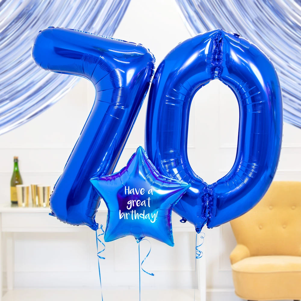 Mark their 70th birthday with this stunning bunch of helium balloons, complete with personalised message! Each helium balloon bouquet includes two bright blue 26″ number balloons and a 20″ blue foil star, all tied together with curling ribbon and a balloon weight. This stunning balloon bunch arrives fully inflated in a box and will stay afloat for around 3-5 days! Our stunning bunches make a truly unique gift and can be delivered to the lucky celebrants door on a day of your choice or are a lovely decoration to make them smile first thing in the morning!
