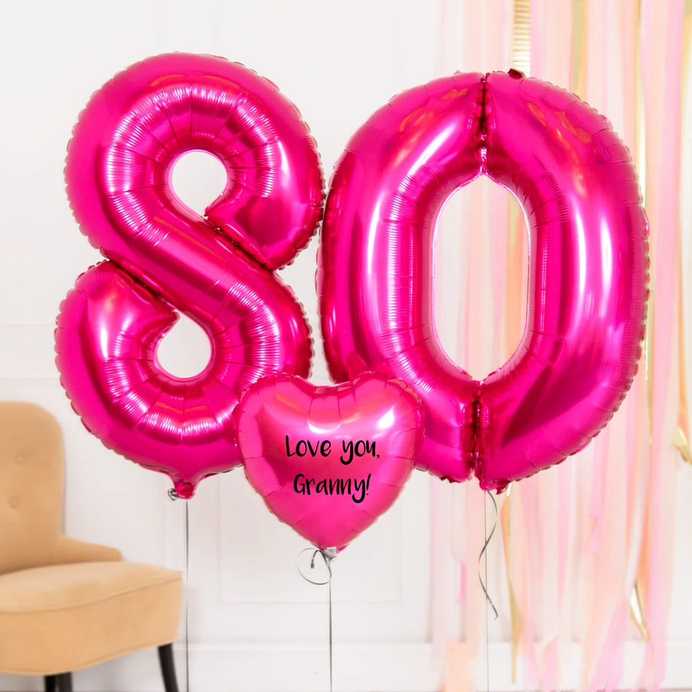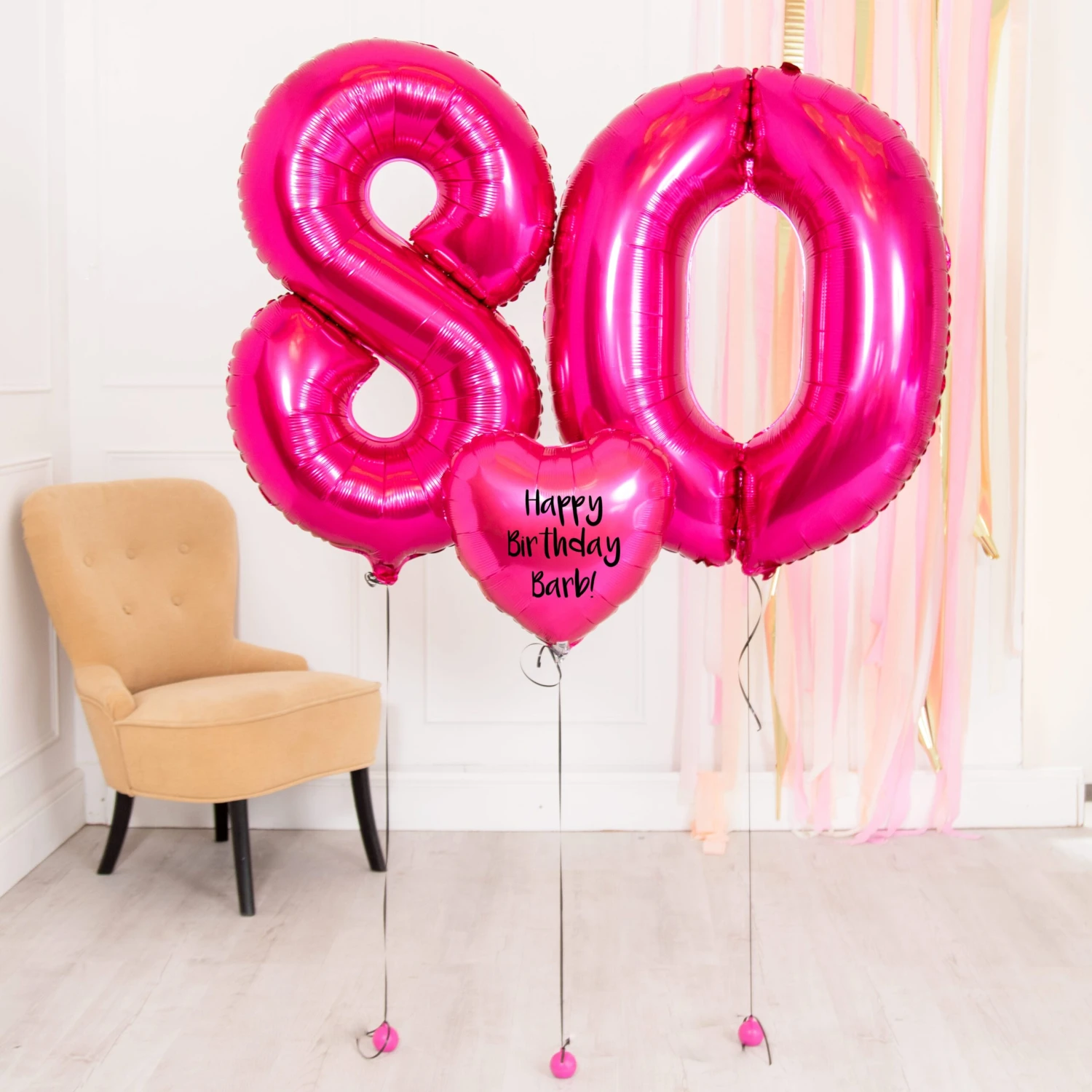 Mark their 80th birthday with this stunning bunch of helium balloons, complete with personalised message! Each helium balloon bouquet includes two bright pink 26″ number balloons and a 20″ pink foil heart, all tied together with curling ribbon and a pink balloon weight. This stunning balloon bunch arrives fully inflated in a box and will stay afloat for around 3-5 days! Our stunning bunches make a truly unique gift and can be delivered to the lucky celebrants door on a day of your choice or are a lovely decoration to make them smile first thing in the morning!