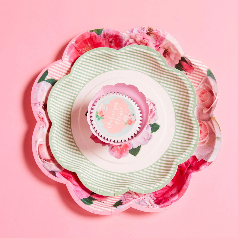 The pack includes eight plates: four in a pink pinstripe and rose design, and the other four in a mint pinstripe and rose design. Exclusively designed by Party Pieces.