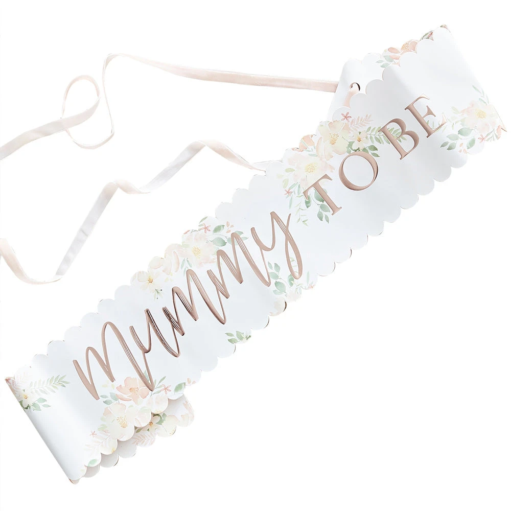 Featuring a stunning rose gold and floral design with scripted writing saying ‘Mummy To Be’, this sash is a wonderful addition for the soon to be mum at her baby shower celebration. It also comes with a velvet tie that fits perfectly over any size bump and is certain to make her stand out at the special occasion!Â