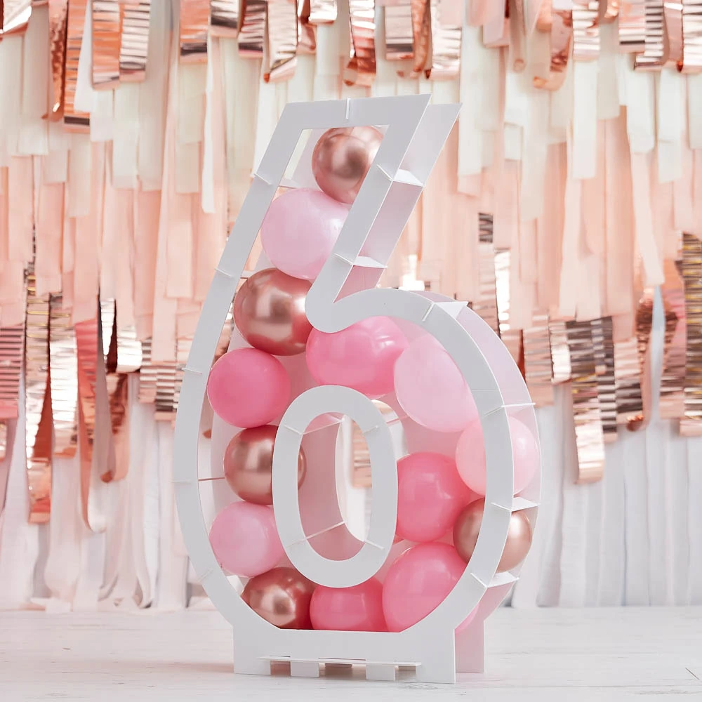 Super simple and easy to assemble, this number balloon mosaic is the perfect addition to your celebration whether it be a huge milestone birthday, a kids party or even an anniversary. Add some colour to the frame with your choice of our rainbow brights or blush pink 5 inch party balloons that come in a pack enough to fill two number stands. It will for sure be the main attraction at a range of special occasions!