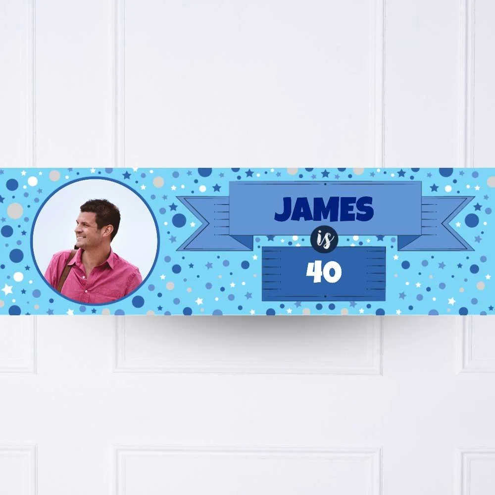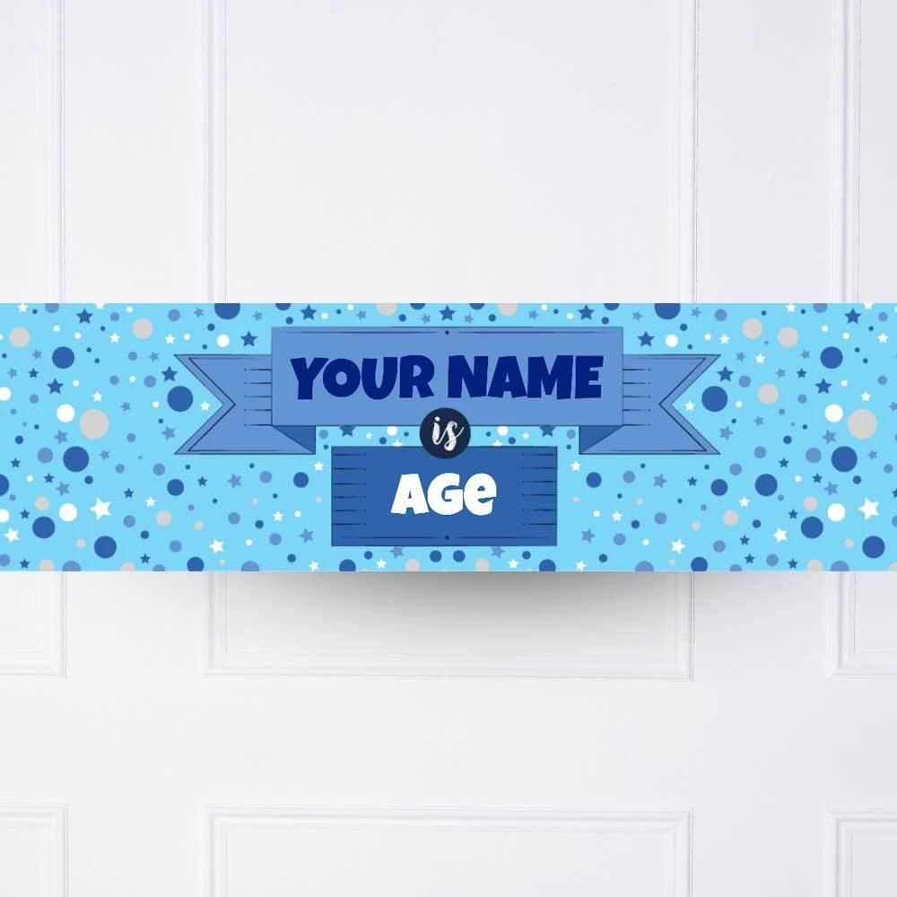 Featuring a bright blue background with a polka dot pattern, this fun party banner can be customised with your choice of image, age, and message!