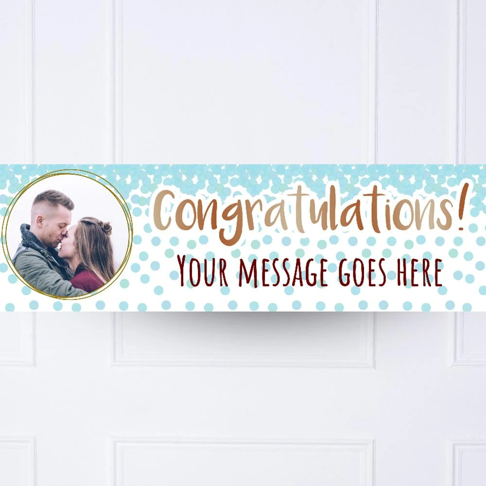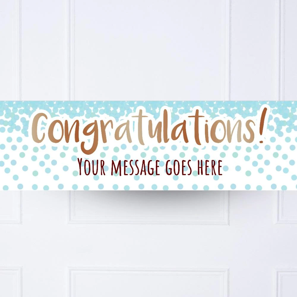 This high-quality vinyl banner comes with a pastel blue confetti design and a stylish gold cursive congratulations message!