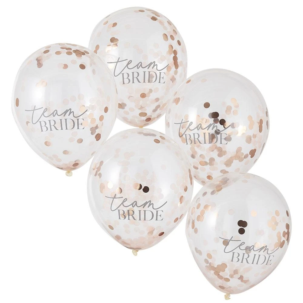 This Pack of 5 Hen Party Balloons Feature Team Bride Messages and Shiny Rose Gold Confetti!