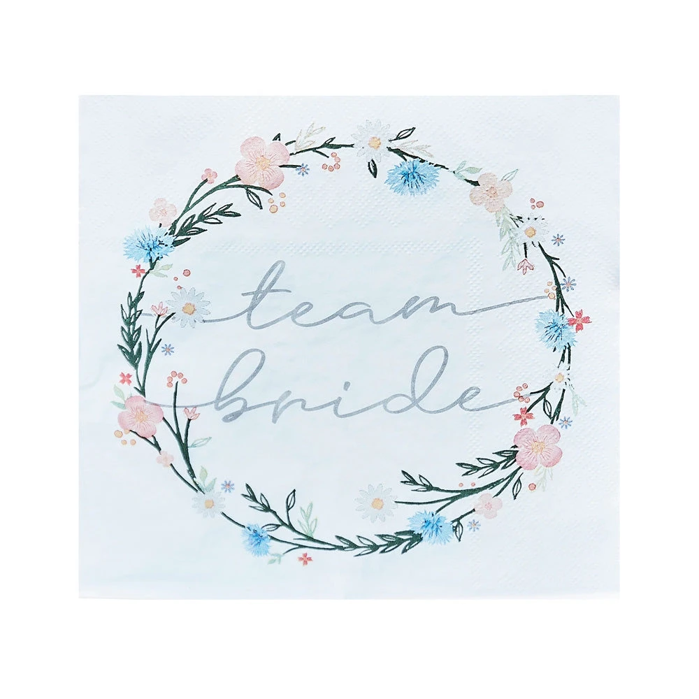 Serve tasty treats or mop up those inevitable drink spills with these paper napkins that feature ‘team bride’ and a pretty floral design. They are a great choice for hen dos and are also eco-friendly and fully recyclable. You’ll get 20 in each pack that will help keep your party venue clean, whilst make it look amazing, especially when combined with our matching cups and plates.Â