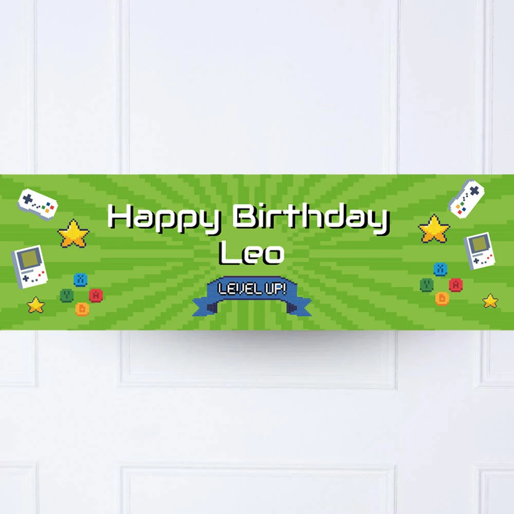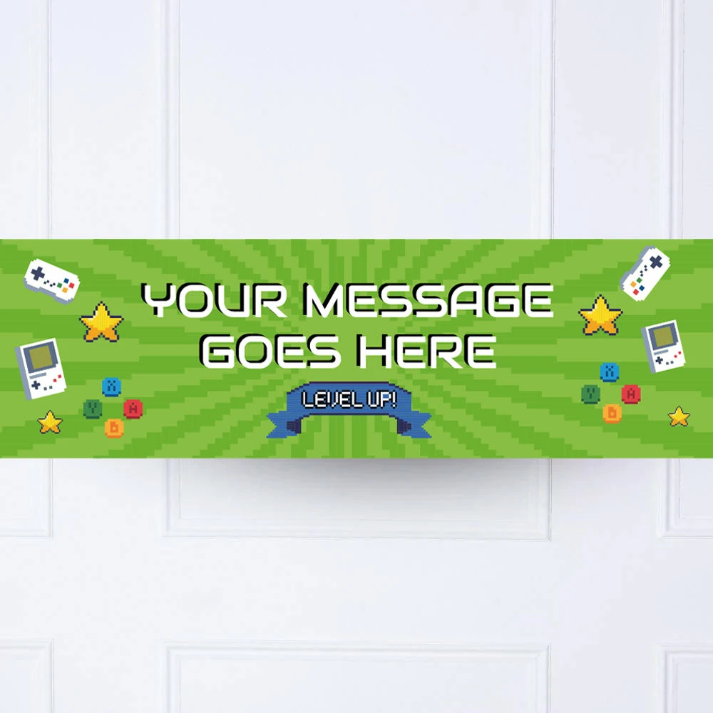 Featuring a green background with a graphic text font with stars and controllers. Add a personalised message and your own image above a “Level Up” graphic. It will be the winning decoration at your celebration whilst bringing attention to the special occasion.