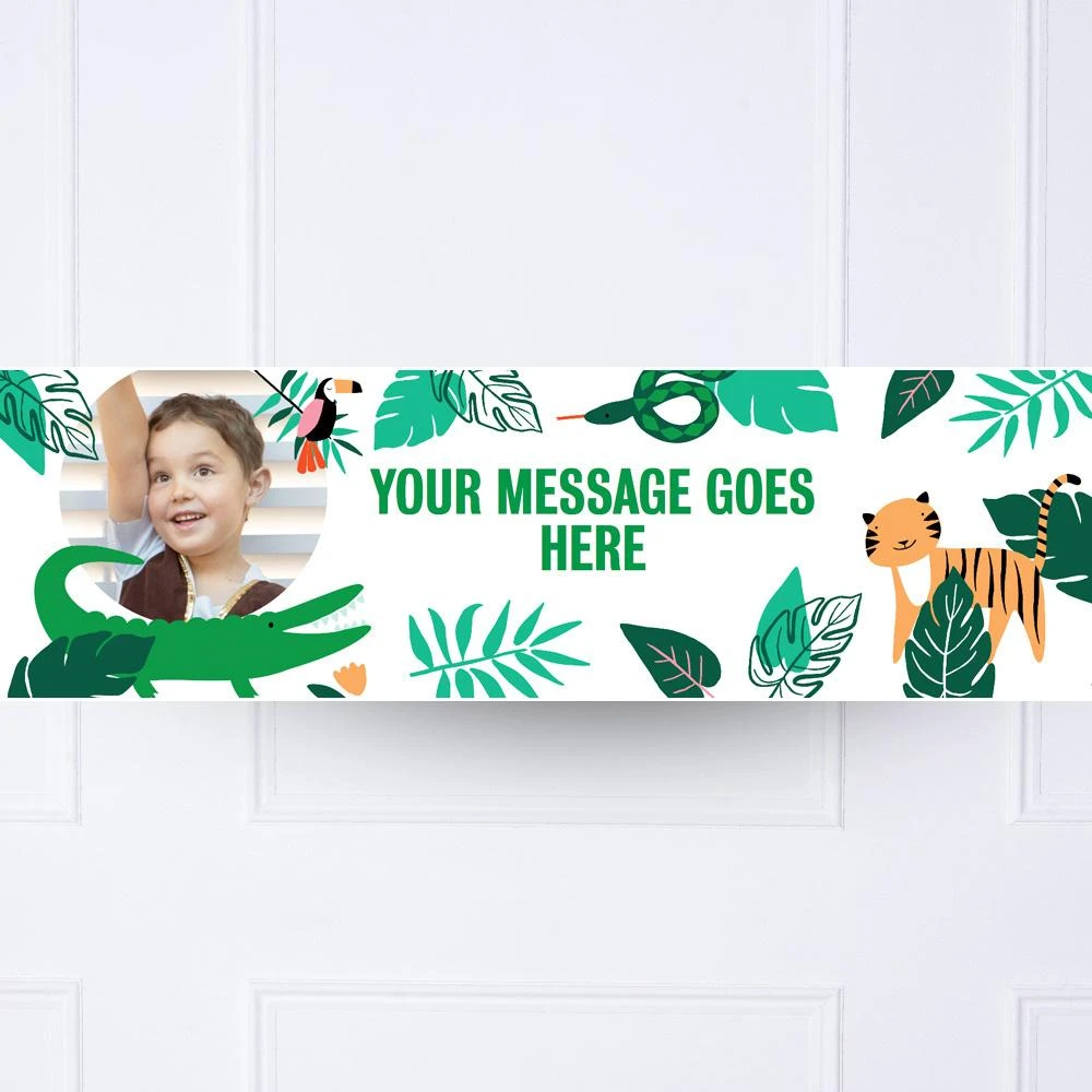 This Banner Features Cute Illustrations of Green Palm Leaves, a Tiger, Crocodile and Jungle-Themes!