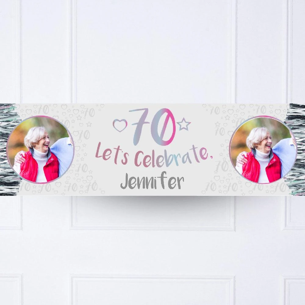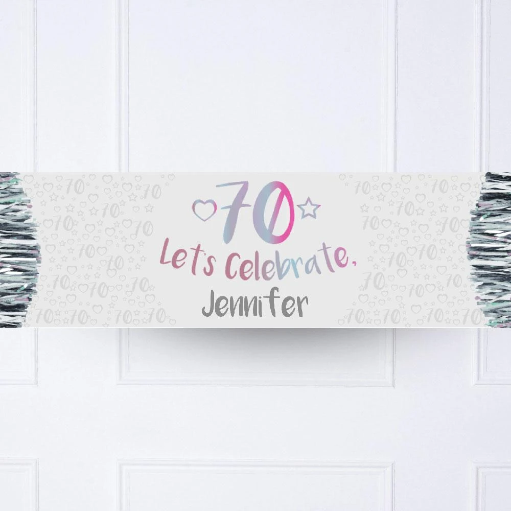 Celebrate a 70th with a Silvery Iridescent Personalised Party Banner!
