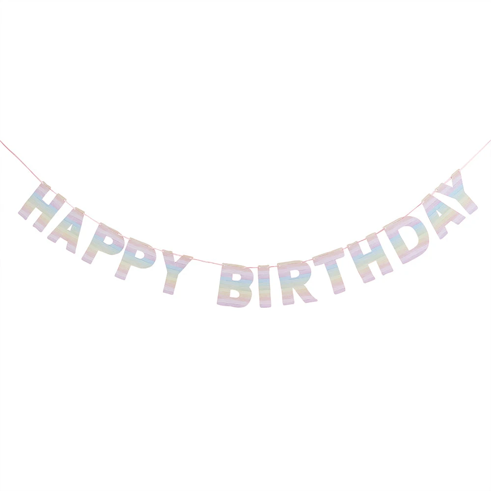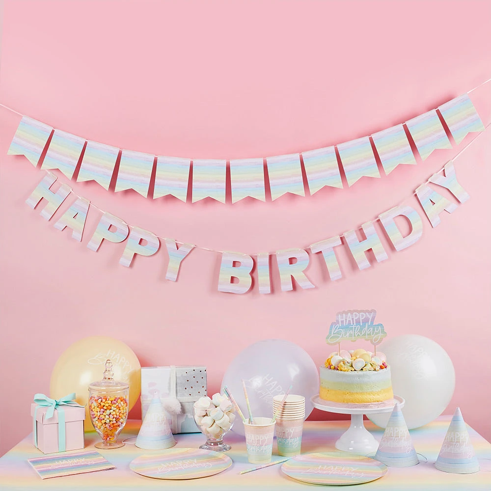 Style with pastel tones this celebration to complement your festive location. An exquisite pastel rainbow theme will continue to roll in when showcasing this dreamy birthday banner, made from eco paper with no foiling or plastic. Hang your values and an array of colours for a planet-friendly party!