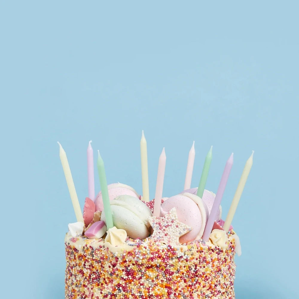 Perfect for birthdays, wishes, and cakes, this twelve-pack of sweet skinny candles brings a touch of whimsical colour to any celebration. Make your next cake a real showstopper!