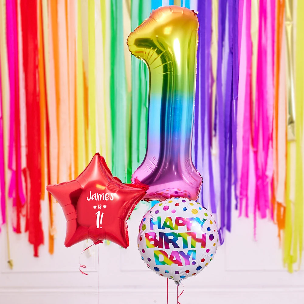 Mark their 1st birthday with this colourful bunch of helium balloons, complete with personalised message! Each helium balloon bouquet includes a multi-coloured 34″ number balloon, a 20″ red foil star and a colourful message balloon, all tied together with curling ribbon and a balloon weight. This stunning balloon bunch arrives fully inflated in a box and will stay afloat for around 3-5 days! Our number balloon bunches are a great decoration and will certainly make your little one smile! We can also deliver our inflated balloons directly to their door if sending to a family member or friend as a gift!