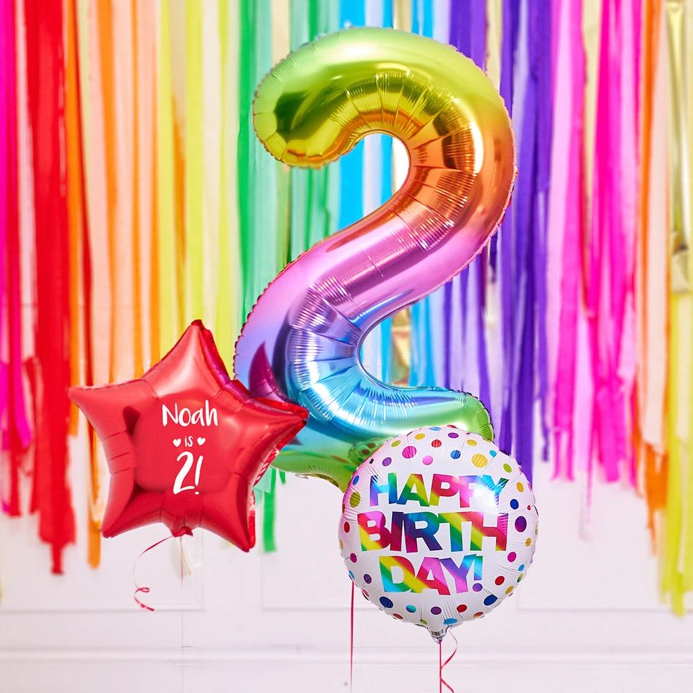 Mark their 2nd birthday with this bright bunch of helium balloons, complete with personalised message! Each helium balloon bouquet includes a metallic rainbow 34″ number balloon, a 20″ red foil star and a spotted message balloon, all tied together with curling ribbon and a balloon weight. This stunning balloon bunch arrives fully inflated in a box and will stay afloat for around 3-5 days! Our number balloon bunches are a great decoration and will certainly make your little one smile! We can also deliver our inflated balloons directly to their door if sending to a family member or friend as a gift!