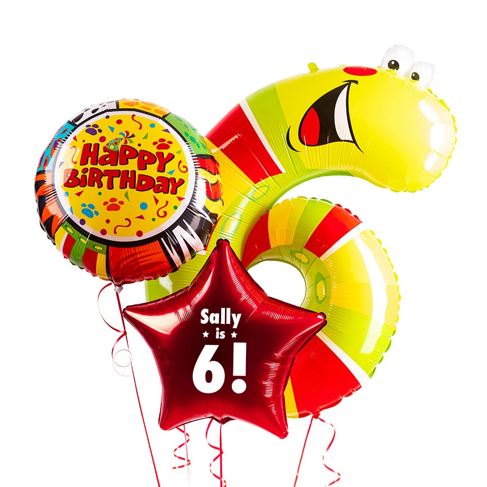This foil balloon bundle features a cheerful caterpillar number 6 measuring 40in, a foil ‘happy birthday’ balloon and a metallic red star balloon which can be personalised with a name of your choice! Each balloon bouquet comes complete with red curling ribbon and a balloon weight so you can create a truly stunning display. The balloon bunch will arrive fully inflated, boxed and with an optional gift card on the day of your choice, so ideal if you’re wanting to send as a gift!