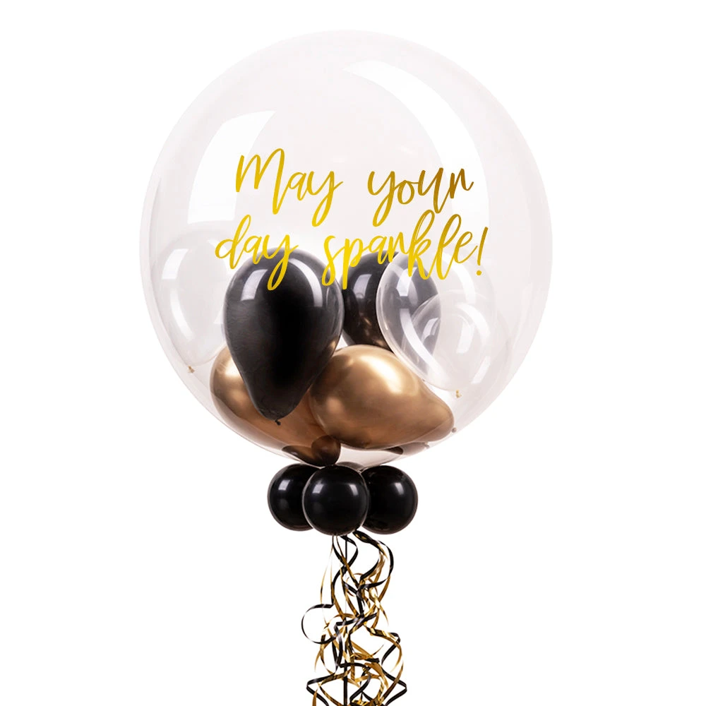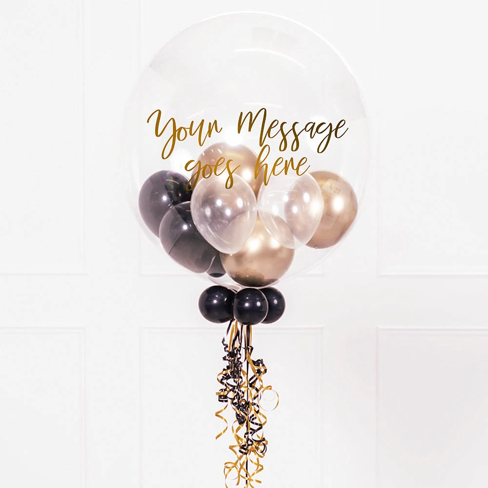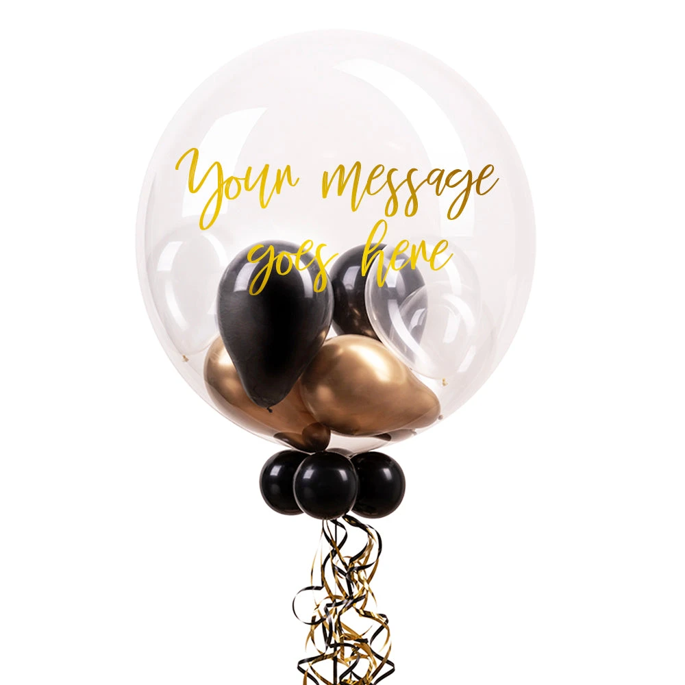 In stunningly sophisticated black and gold, our personalised bubble balloon is guaranteed to deliver a smile direct to their door. This 24-inch balloon can be customised with a personal message using our online editor and filled with mini-balloons in a mixture of chrome gold, onyx black and diamond clear colours.