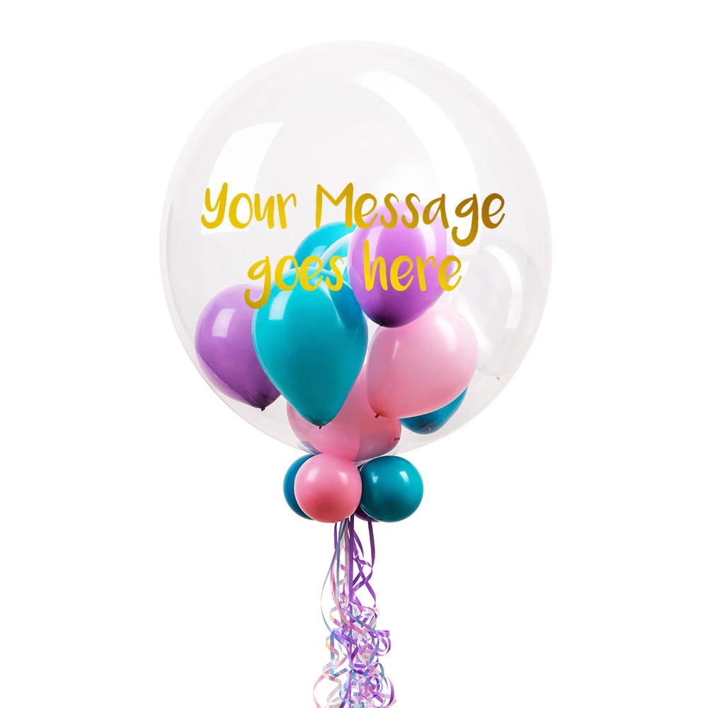 This personalised bubble balloon will be sure to deliver a smile for birthdays and underwater themed celebrations. Customise this 24-inch balloon with a personal message using our online editor. Filled with mini balloons in a mixture of diamond clear, tropical teal, Caribbean blue, lilac and pink colours.