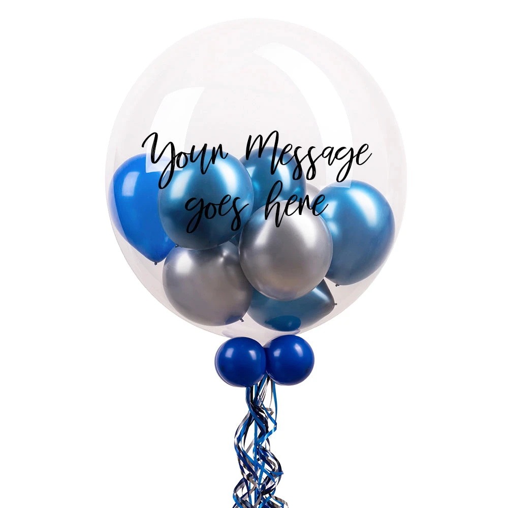 This stylish balloon arrives inflated and is a great way to deliver a smile to the lucky celebrant. Filled with mini balloons in a mixture of blue and silver colours, and customised with a message of your choice using our online editor.