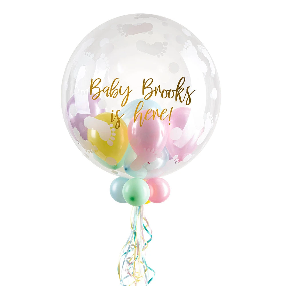 Great for gender reveals, baby showers and first birthdays. This beautiful 24-inch balloon comes with a footprint design and is filled with mini balloons in a combination of blue, yellow, green, purple and pink. Customise with a message of your choice using our easy online editor.