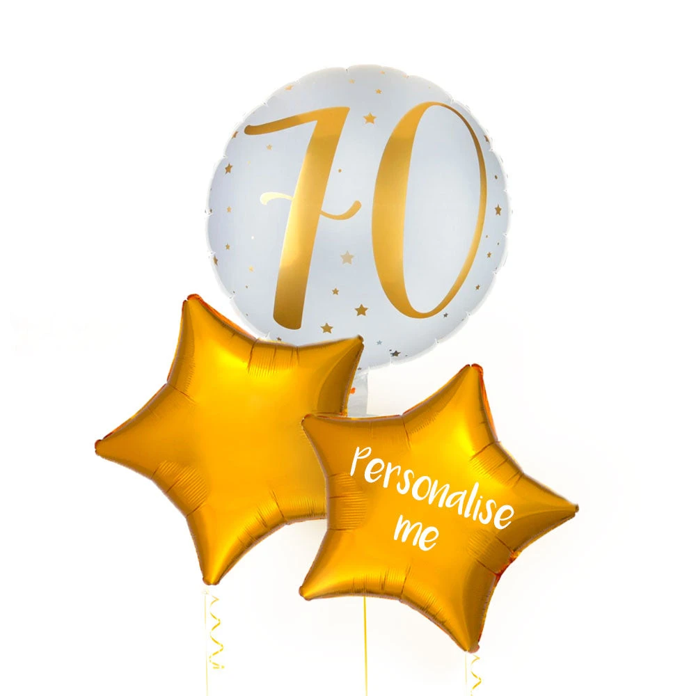 This dazzling bouquet of helium-filled balloons includes a round design featuring a ’70th’ message and gold two stars which can be personalised with your message. They’ll arrive fully inflated and boxed, ready to place in your party venue or send to a loved one’s door and will stay afloat for around 3-5 days!
