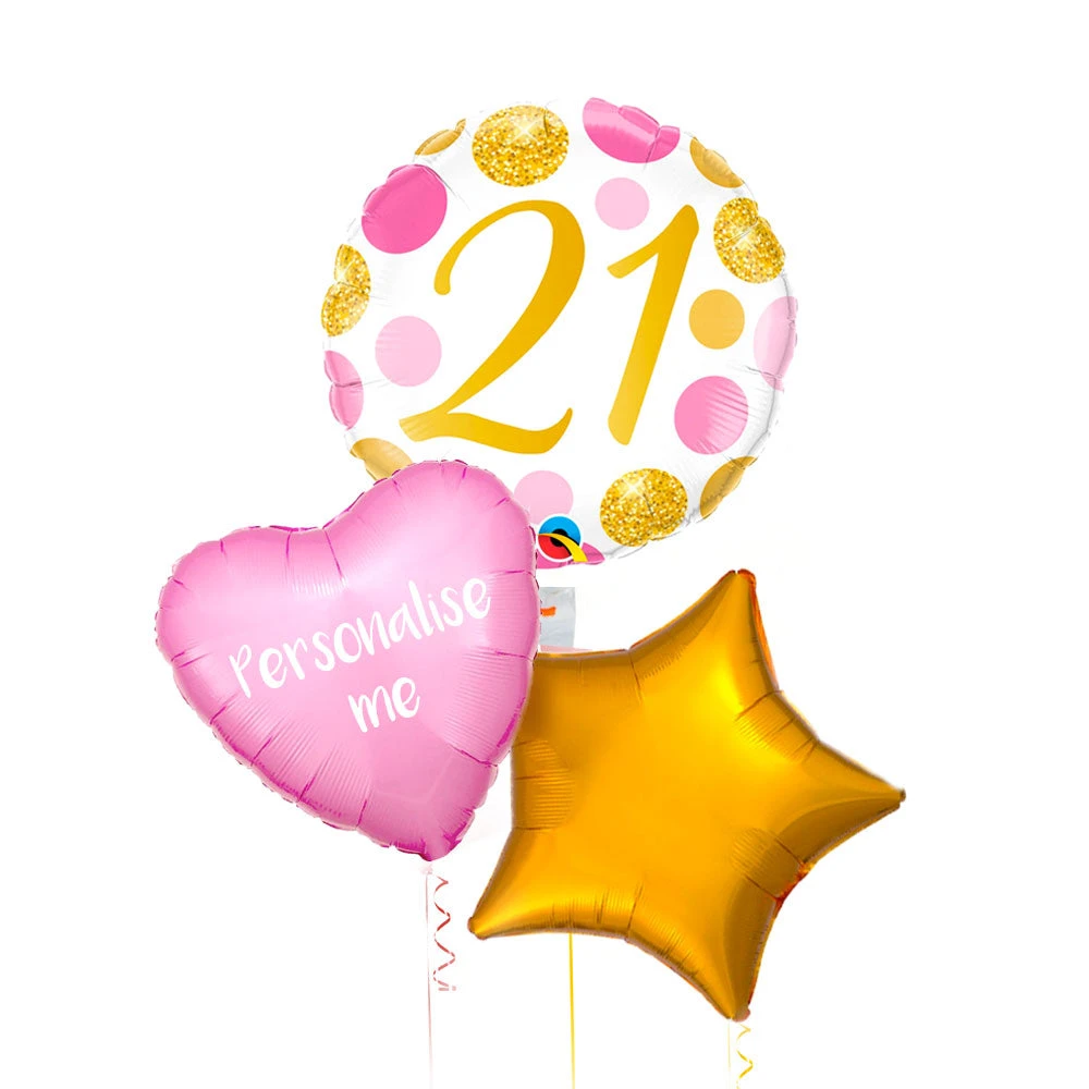 Add your message to the star-shaped balloon for an extra special touch on their birthday. The set comes with three balloons β one pink love heart, one gold star and one round design with β21β messaging βΒ all held beautifully together with curling ribbon and a balloon weight. Use them as a stunning party decoration or deliver them straight to the celebrant’s door as a lovely surprise on their special day!