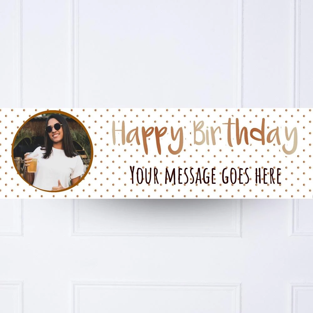 This banner features an elegant rose gold spotty background with matching ‘Happy Birthday’ messaging. Add your personalised message and photo to complete the look!
